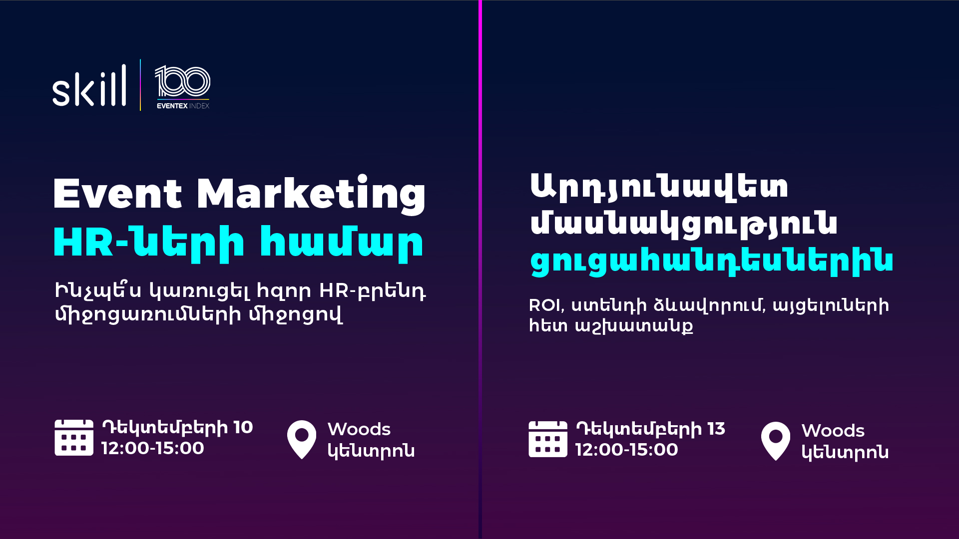 «Event Marketing HR-ների համար» դասը տեղի է ունենալու դեկտեմբերի 10-ին, Woods կենտրոնում, ժամը 15:00-18:00, իսկ «Արդյունավետ մասնակցություն ցուցահանդեսներին» դասը դեկտեմբերի 13-ին, Woods կենտրոնում, ժամը 15:00-18:00 ։